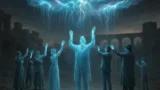 夜の妖怪街で、空に龍のような霊的エネルギーが渦巻き、霧雨の中を幽霊や妖怪が歩いている様子の写真風画像。 気象予測