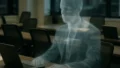 近代的な会議室で、半透明の幽霊社員たちとスーツ姿の死霊部長がホログラムのワークフロー図を見ながら打ち合わせしている写真。 事業継続