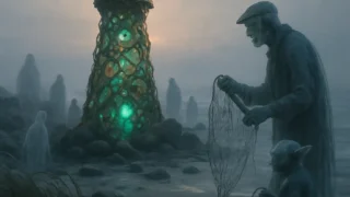 かつて人間界だった浜辺の片隅、忘却湾の磯でこのところ異様な賑わいが生じている。発端は、夜明け前に突如現れた“漂流灯台オブジェ”を巡って集まり始めた幽霊や妖怪、漂泊精霊たち。古い漁村跡地に広がる潮干狩り場には、透明な網を抱えた半身透けの老人や、シーグラスで作られたカゴを肩にかけた小鬼らが次々訪れ、高波にあぶれた海浜植物の間を縫ってニュースポットを探索している。